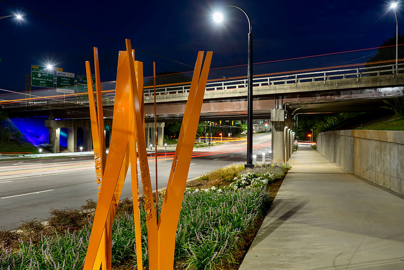 Excelsior establishes a cohesive cultural and spatial identity across two distinct sites within Charlotte’s Historic West End, transforming both a major civic intersection and a corridor into a connected public experience. Despite being separated by distance and elevation, the works operate as a unified system; linking movement, memory, and place.